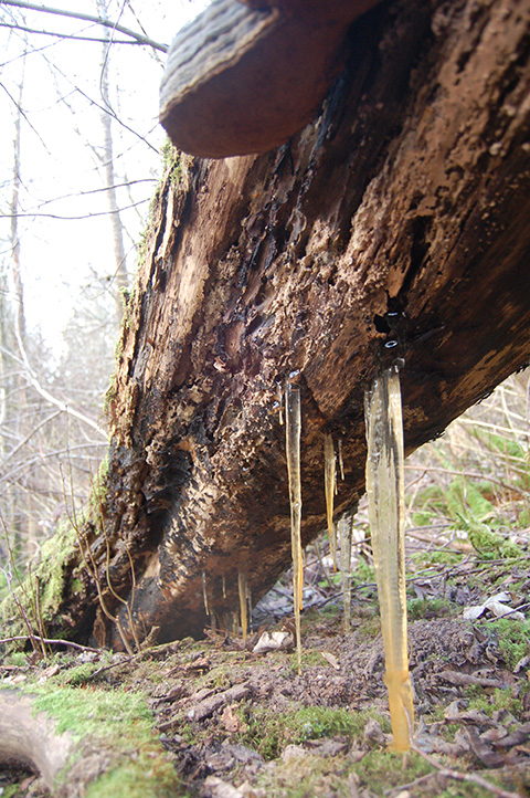 Jeg må ned på alle fire for at komme under tornede kviste og ind for at vise dig et par Tøndersvampe på en væltet stamme. Overalt ligger hvide sneglehuse som konfetti efter en nytårsfest. Så opdager jeg de gullige “istapper”, der strømmer fra den frønnede stamme og ned mod jorden. Jeg har vist set for mange film, for jeg tør pludselig ikke undersøge tappernes konsistens nærmere. Det kunne jo være Alien-slim, og jeg vil nødig sprede invasive arter fra det ydre rum i den danske natur.