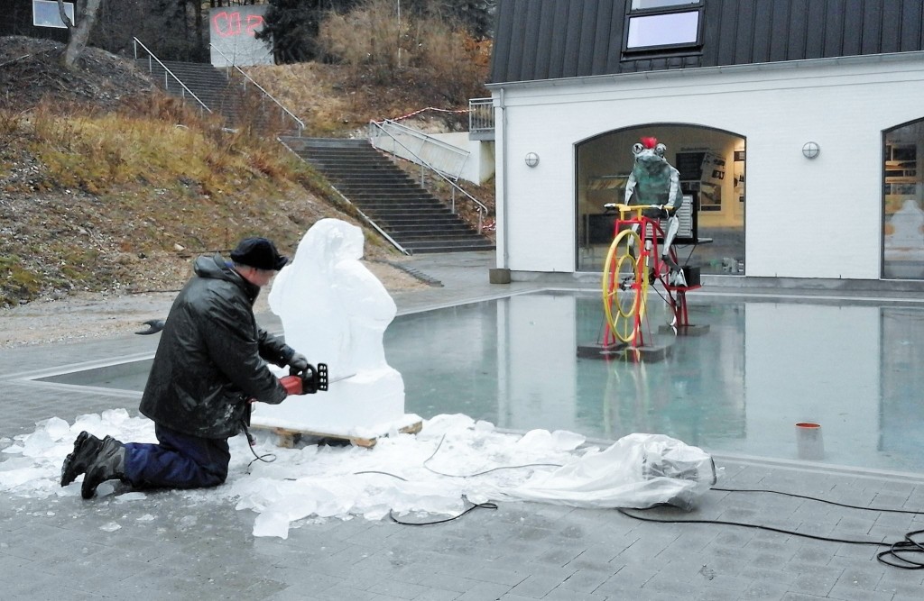Billede,- lys,- og skulpturkunstner Søren Lyngbye gik løs på isklumpen ved middagstid, og nu er det spændende, hvor længe Is-pingvinen holder. Punk Frog, der cykler på den solenergi, der hentes ned i tasken på bagagebæreren, kører imens. I baggrunden, ved indgangen til minen, ses Jakob Fuglsang Mikkelsens CO2 3D (foto Lise Nedergaard)