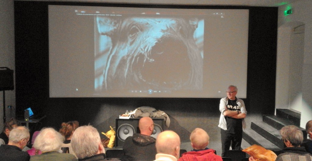 Jens Galschiøt i Rebildcentrets biograf. På lærredet bag ham kigger en af hans indre svinehunde med (foto Lise Nedergaard)