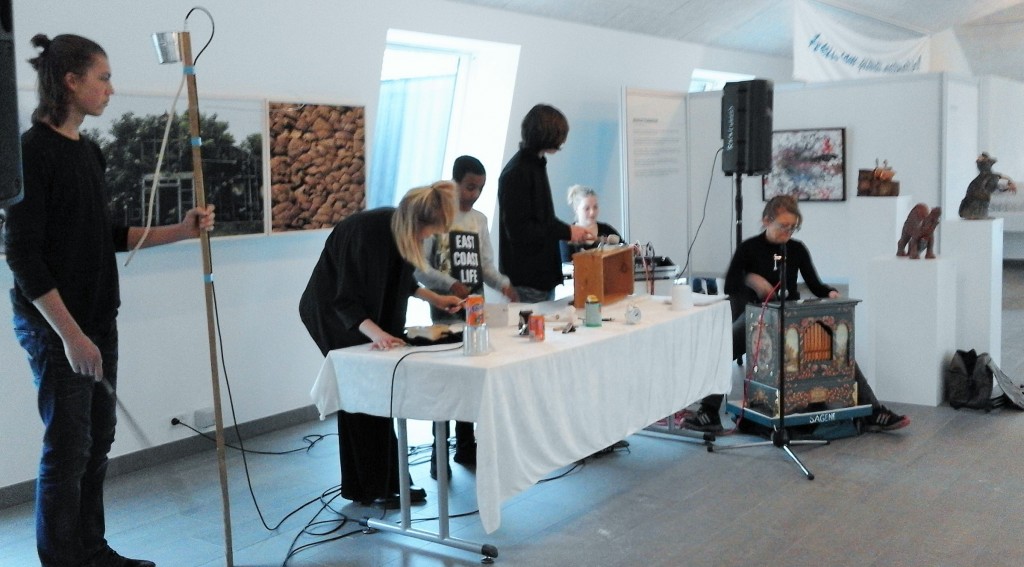 Eleverne fra Skørping Skole har, sammen med musiklærer Jacob Graae Hansen, arbejdet på skralde-kompositionen siden i tirsdags. Fra venstre er det Magnus på kontrabøtte, Karoline på kærlighedsæske og æggedeler, Thomas på musikskuffe og mælkeskummer og Villiam på instrument uden navn bygget af alt godt fra garagen, bl.a. fjederen fra et gammelt skak-ur. Fra højre er det Tulle Ruth og Ane Østergaard, og i baggrunden anes en mindre kopi af Jens Galschiøts Unbearable og tre værker af Vibeke Sunde, bl.a. And the winner in the worldwideclimat-changesurvivelcompetition is ….. the rat. (foto Lise Nedergaard)
