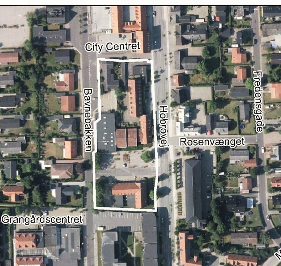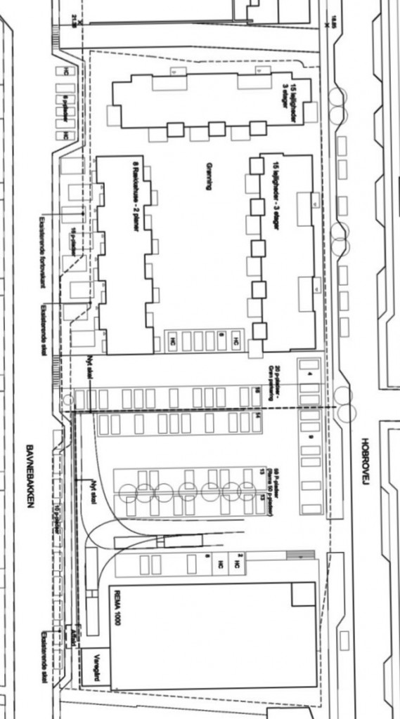 Illustrationsskitsen herunder er et eksempel på, hvordan man kan forestille sig, området bebygges. Mod syd er der placeret en dagligvarebutik og mod vest på Bavnebakken 8 rækkehuse i 2 etager i max. 8,5 m højde. Mod nord op til City Centret bliver der mulighed for at opføre en bygning i 3 etager i max. 13 m højde med 15 lejligheder, og mod øst ud til Hobrovej også en bygning i 3 etager med 15 lejligheder, men med mulighed for desuden at indrette butikker i stueetagen.